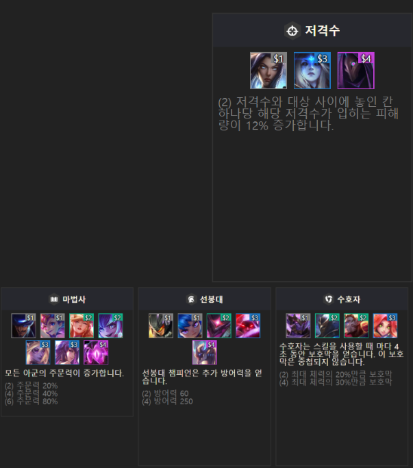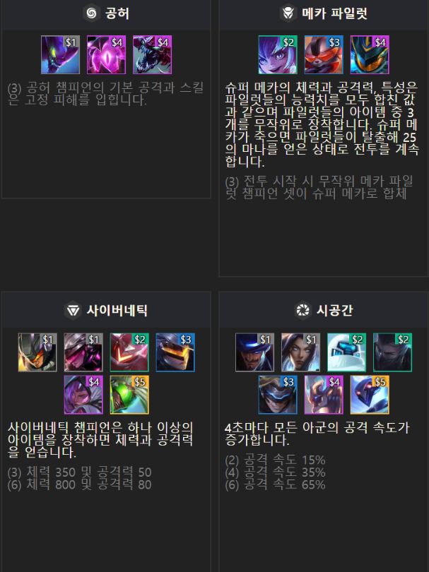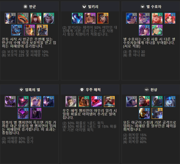 현재 롤토체스 시즌3는 위 시너지로 진행 중이고, 추후 패치를 통해 제라스나 (암흑의 별, 마법사) 시너지의 캐릭터 숫자및 효과가 늘어난 패치가 예정 중입니다.